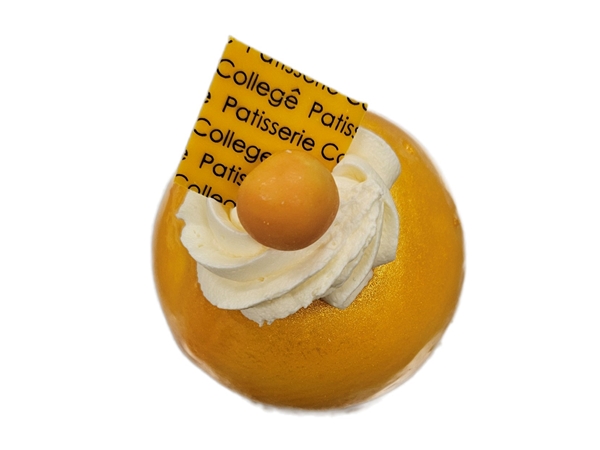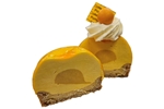 Yoghurt Mangobavaroise op een sloffenbodem met een vulling van passiecremeux