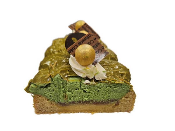 Sloffenbodem met pistache bavaroise, chocoladecanache, witte chocolade en kunefe